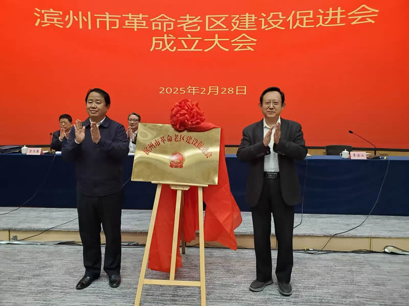 会上,王成波和杜玉杰共同为滨州市老促会成立揭牌,赢得了热烈掌声。